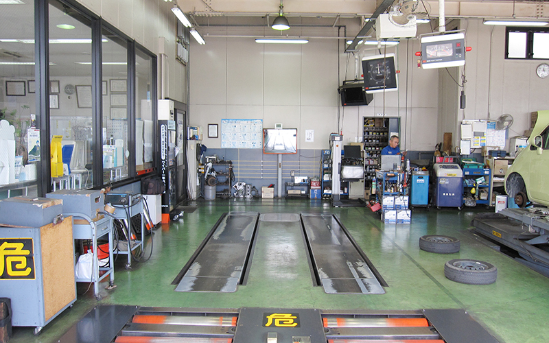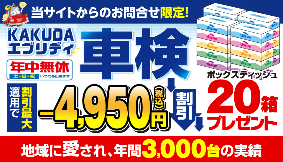 地域に愛され、年間3,000台の実績。車検基本料金9,680円(税込)、最大割引-4,950円(税込)