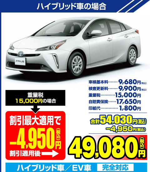 ※掲載の価格はすべて税込価格となります。※部品交換が必要な場合、部品代、交換料金が発生します。 また、部品の経年劣化による不慮の破損などについても追加料金が発生する場合がございます。※ワンボックス・RV車の一部、貨物車、外車、特殊車は別途料金となります。また違法改造車はお引き受けできませんので予めご了承ください。※重量税は、エコカー減税非対象車初年度登録から13年未満のお車の税額です。(13年以上経過したお車の重量税は上記額とは異なります。)※エコカー減税対象車の重量税は、上記額より減額されます。※印紙代はインターネット申請(OSS)を利用しない場合の金額です。※上記は2023年4月現在情報となります。
