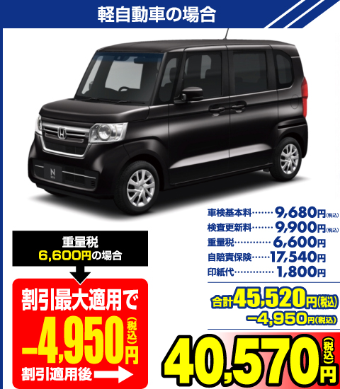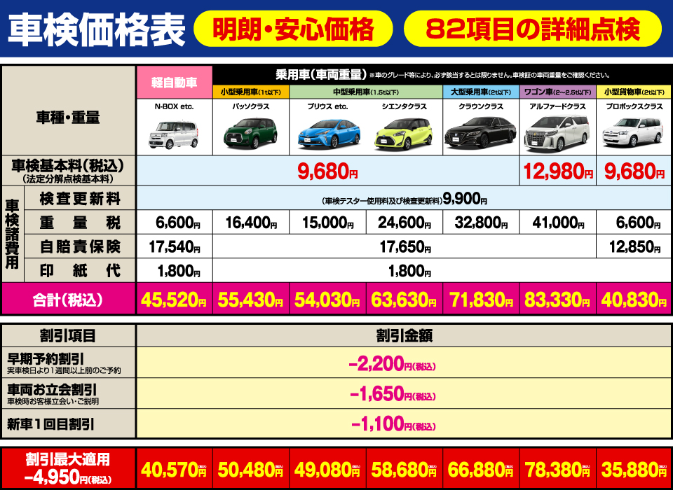 最大-4,950円(税込)割引! 〇早期予約割引 -2,200円(税込) ・実車検日より1週間以上前の予約 〇車両お立会割引 -1,650円(税込) ・車検時のお客様立会・ご説明 〇新車一回目割引 -1,100円