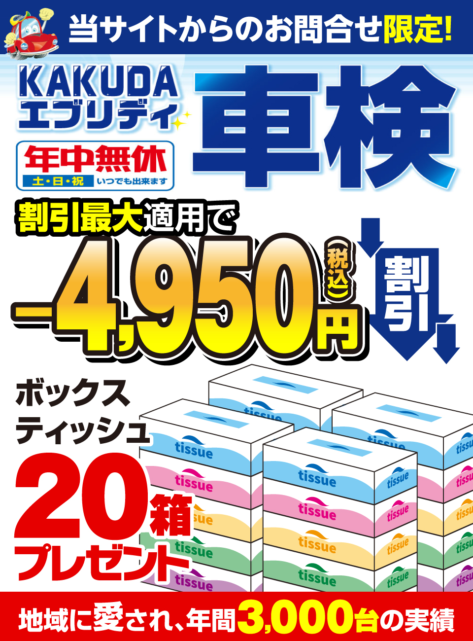 車検・整備・板金は、安全・確実なエブリデイ車検の角田石油へ。早期予約割引や、立会い割引など豊富な割引もご用意しております。